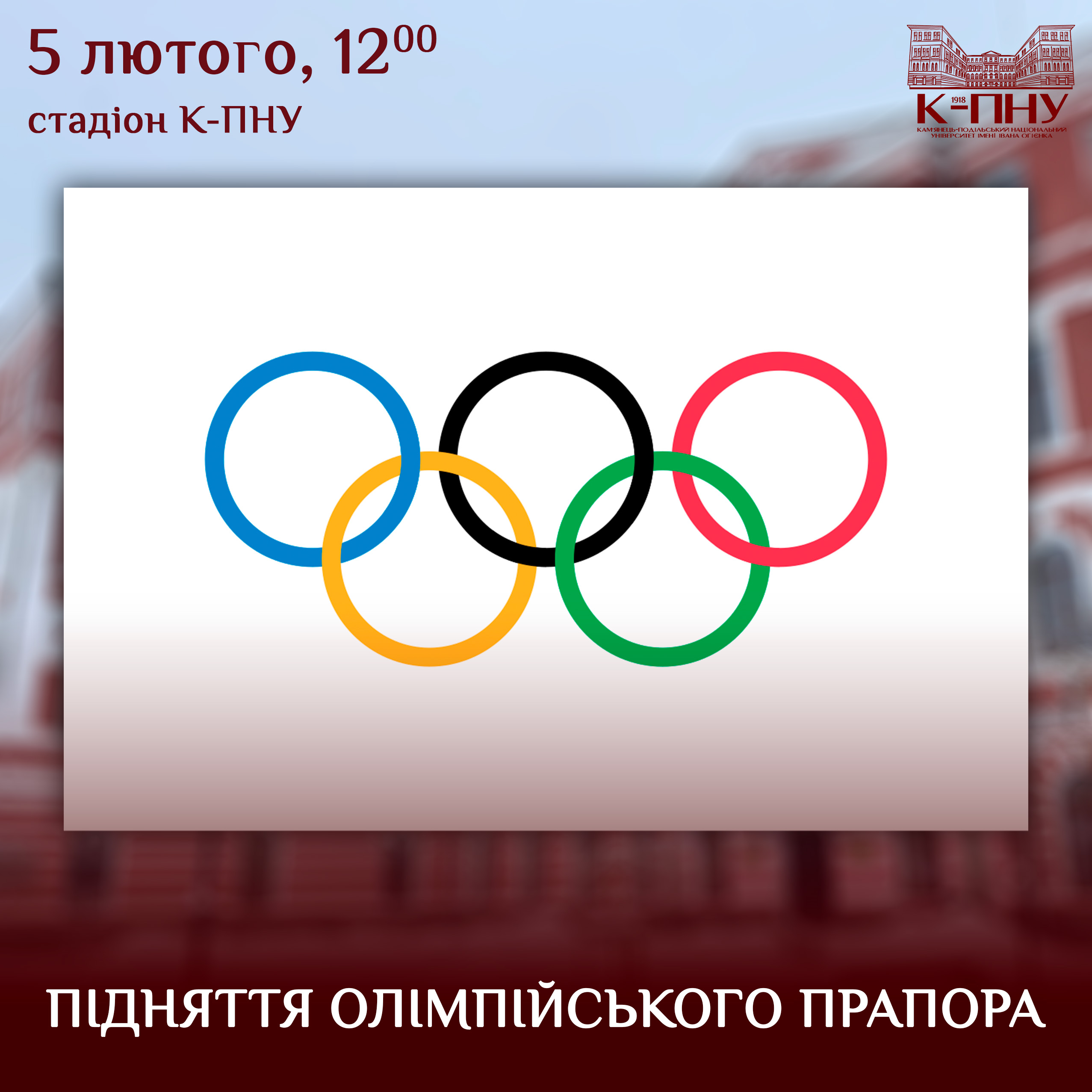 5 лютого 2026 року о 12:00, напередодні відкриття XXV зимових Олімпійських ігор в Італії, на стадіоні Кам’янця-Подільського національного університету імені Івана Огієнка, одного з центрів олімпійських осередків Хмельниччини, відбудеться урочисте підняття олімпійського прапора на знак палкої підтримки наших спортсменів.