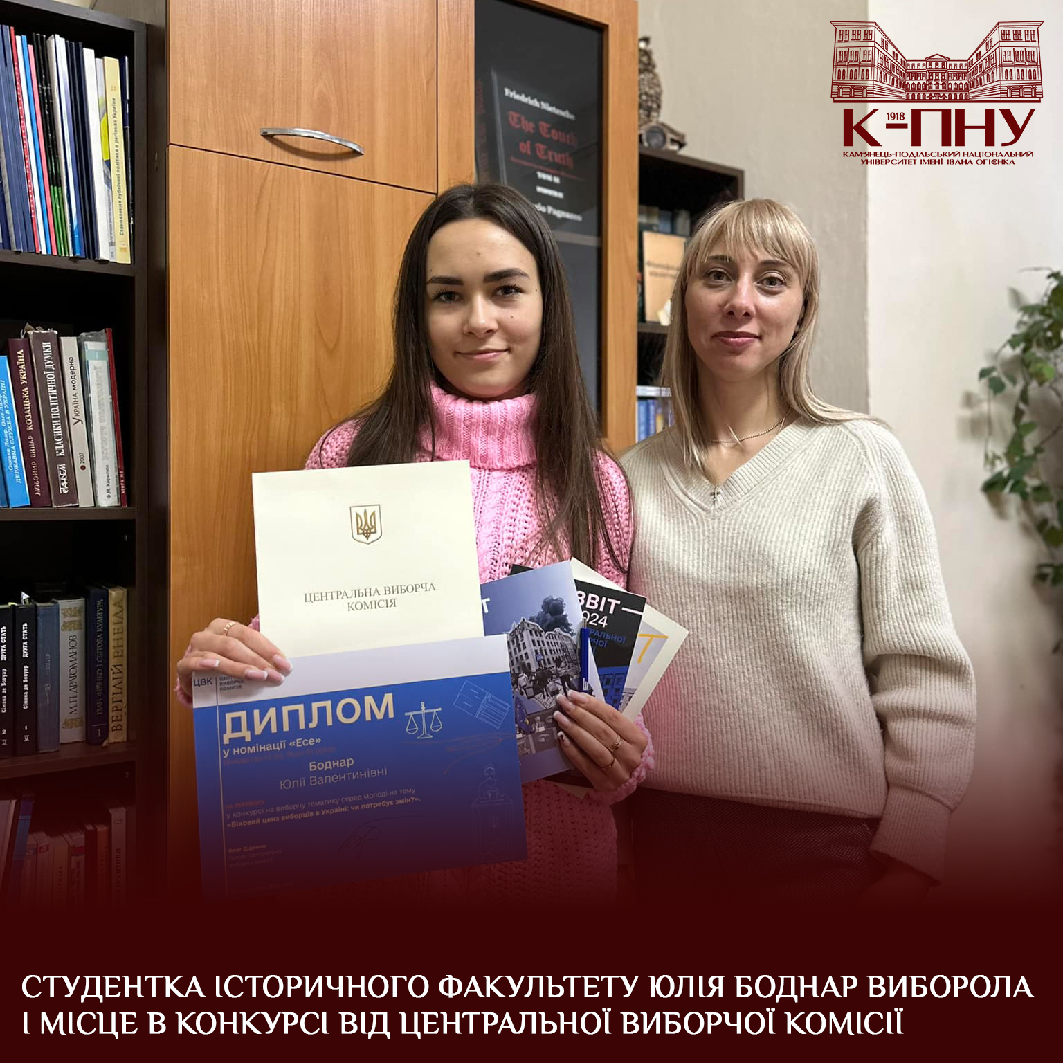 Здобувачка вищої освіти 3-го курсу історичного факультету спеціальності «Політологія» Юлія Боднар стала переможницею конкурсу на виборчу тематику для молоді, організованого Центральною виборчою комісією. За підсумками змагання вона отримала диплом за І місце, а також символічні подарунки від ЦВК.