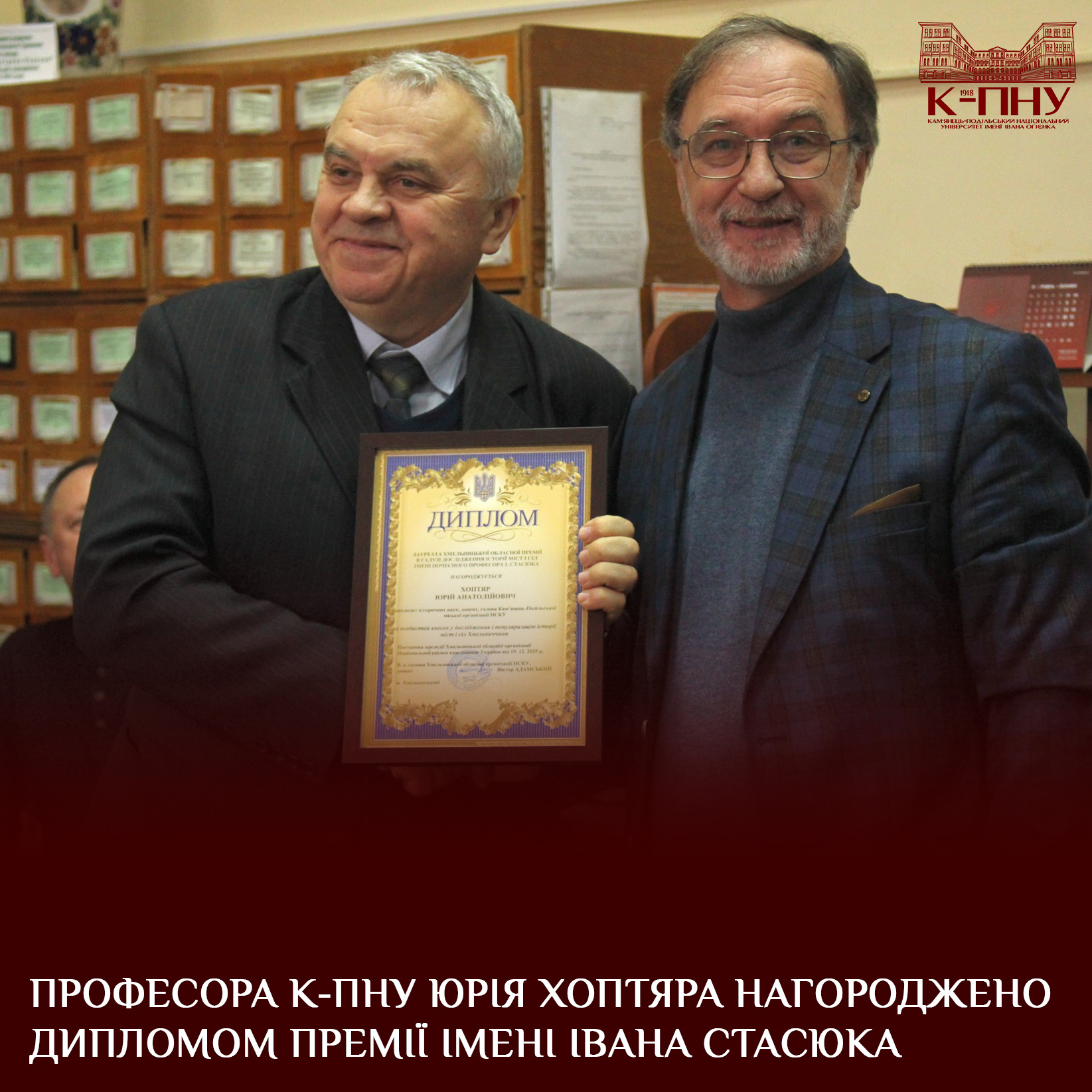 Диплом премії імені Івана Стасюка вручено кандидату історичних наук, професору Кам’янець-Подільського національного університету імені Івана Огієнка Юрію Хоптяру за внесок у дослідження історії міст і сіл Хмельниччини.