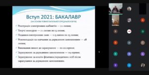 Відповідальний секретар приймальної комісії Василь Чабанов ознайомив присутніх з новаціями вступної кампанії 2021 року, правилами вступу до Кам’янець-Подільського національного університету імені Івана Огієнка, зокрема термінами проведення вступної кампанії, діяльністю консультаційного центру, особливостями проведення творчих конкурсів (які будуть складати вступники з двох спеціальностей: 023 образотворче мистецтво і 017 тренер з видів спорту). Василь Григорович наголосив, що в цьому році для вступу на здобуття освітнього ступеня “магістр” обов’язково потрібно складати ЄВІ з іноземної мови для всіх спеціальностей, розповів про проведення Всеукраїнської олімпіади та пробного ЗНО в К-ПНУ. Він також відповів на всі запитання, які цікавили учасників зустрічі.