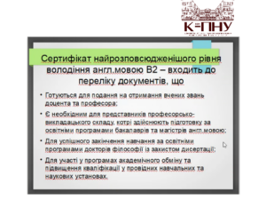 Спікером наступного заняття, що відбулося 25 березня 2021 р., була Сліпачук Наталія Миколаївна, керівник Лінгвістичного центру. Наталія Миколаївна розповіла про основні напрями діяльності Лінгвістичного центру, можливість підготовки до складання іспиту Pearson Test of English General та отримання міжнародного сертифіката з англійської мови, визнаного багатьма країнами світу. Зауважимо, що відкриття Центру підготовки до міжнародних іспитів «Пірсон» дає великі можливості для всіх, хто прагне підтвердити свої мовні навички для подальшої освіти або розвитку кар’єри, оскільки англійська мова є найважливішою і найпоширенішою мовою у світі, а володіння міжнародним сертифікатом допоможе розширити професійні перспективи здобувачів вищої освіти та науково-педагогічних працівників.