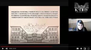 Зореслава Шевчук, керівник пресцентру, методист вищої категорії навчального відділу ознайомила присутніх з підходами до провадження іміджевої політики університету на ринку освітніх послуг у контексті реалізації Стратегічного плану розвитку Кам’янець-Подільського національного університету імені Івана Огієнка на 2018-2022 роки.
