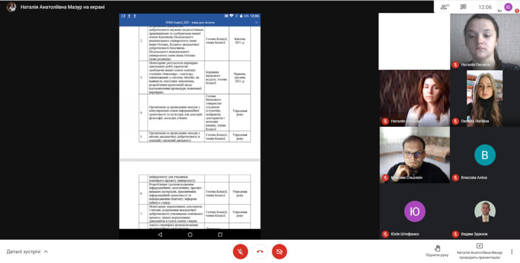 08 квітня відбулося чергове засідання комісії з питань академічної доброчесності Кам’янець-Подільського національного університету імені Івана Огієнка. Згідно з порядком денним голова комісії, завідувач кафедри економіки підприємства, доктор економічних наук, професор Наталія Мазур подала на обговорення план роботи комісії, в якому запропонувала поетапні заходи щодо імплементації питання академічної доброчесності в освітньому і науковому процесі університету, зокрема: удосконалення нормативно-правової бази, здійснення моніторингу перевірки дипломних робіт (проєктів) здобувачів вищої освіти освітніх ступенів «бакалавр», «магістр» на наявність текстових запозичень, організація та проведення заходів з питань академічної доброчесності, аналіз специфіки функціонування інституційного репозитарію університету тощо.