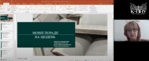 20 квітня 2021 р. було проведено чергову онлайн-зустріч учасників проєкту з Наталією Дмитрівною, під час якої було розглянуто основні шляхи застосування змін до правопису в освітньому процесі та в професійній діяльності науково-педагогічного працівника університету. Надалі обговорення цієї теми відбудеться під час наступної зустрічі в межах проєкту з Наталією Коваленко 26 квітня 2021 р.