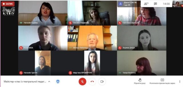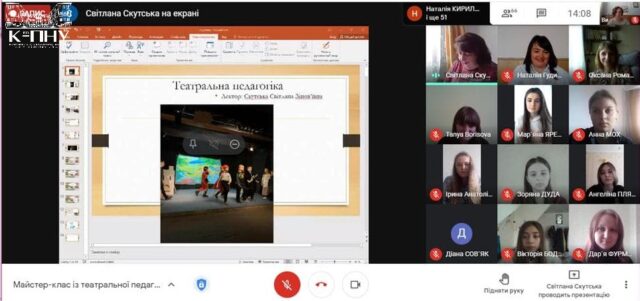 Відкрив Е-вебінар Віктор Лабунець, декан педагогічного факультету, доктор педагогічних наук, професор. Вітальне слово підготувала Наталія Гудима, завідувач кафедри теорії та методик початкової освіти, кандидат філологічних наук, доцент. Світлана Скутська, учитель початкових класів, учитель вищої категорії, «вчитель-методист» Полонської загальноосвітньої школи І-ІІІ ступенів № 2 Хмельницької області, випускниця К-ПНУ, проаналізувала особливості театральної діяльності молодших школярів в освітньому процесі; виокремила лайфхаки для майбутніх учителів початкових класів із метою розвитку артистичних умінь молодших школярів. Оксана Романова, старший викладач кафедри теорії та методик дошкільної та початкової освіти ХОІППО, кандидат психологічних наук, випускниця педагогічного факультету К-ПНУ, тренер Нової української школи, розкрила питання профілактики синдрому професійного вигорання у педагогів початкової ланки навчання. Тетяна Борисова, доцент кафедри музичного мистецтва К-ПНУ, кандидат педагогічних наук, доцент, виокремила функції театрального мистецтва у формуванні особистості молодших школярів в умовах Нової української школи. В обговоренні взяли участь і науково-педагогічні працівники кафедри, і здобувачі вищої освіти. Упевнені, що окреслені методичні рекомендації та презентовані фрагменти освітньої діяльності є інструментом у підготовці здобувачів вищої освіти, майбутніх учителів початкових класів.