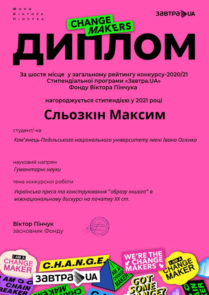 Згідно з рішенням Правління Благодійної організації «Фонд Віктора Пінчука – соціальна ініціатива» Максим посів 6 місце серед 304 учасників Конкурсу – 2020/21 Стипендіальної програми «Завтра.UA».