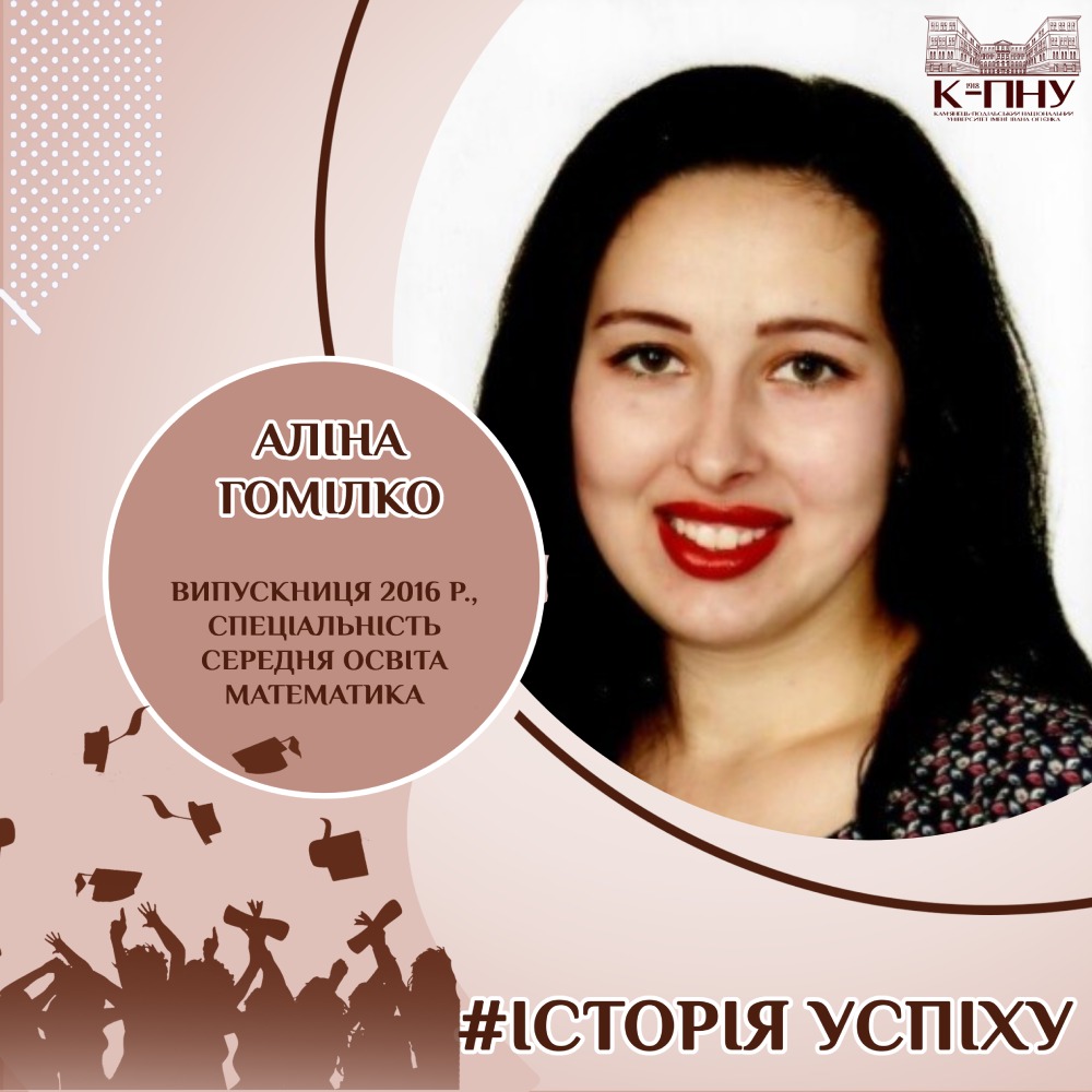 Аліна Гомілко, випускниця К-ПНУ спеціальність Середня освіта (математика), працює вчителем математики та інформатики у Кам’янець-Подільському ліцеї «Славутинка» .