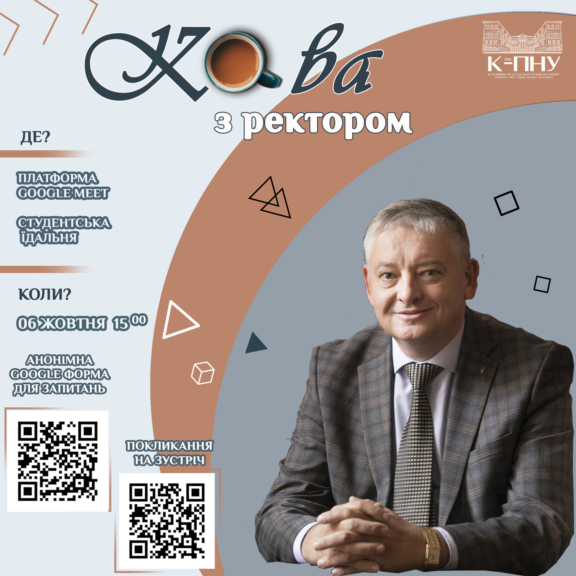 Продовжуємо цикл неформальних зустрічей студентів із ректором К-ПНУ СЕРГІЄМ КОПИЛОВИМ у межах проєкту «Кава з ректором». Зустріч відбудеться 06 жовтня о 15.00 у студентській їдальні, транслюватиметься в соціальній мережі Instagram (прямий ефір на сторінці ректора: https://instagram.com/kopilov_sergii?igshid=araofi95gg7i).