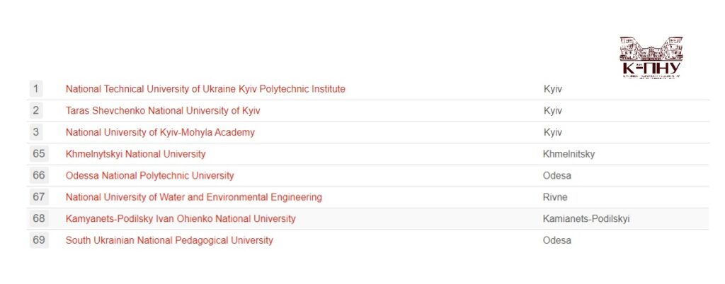 Кам’янець-Подільський національний університет імені Івана Огієнка посів 68 місце серед 184 українських закладів вищої освіти.
