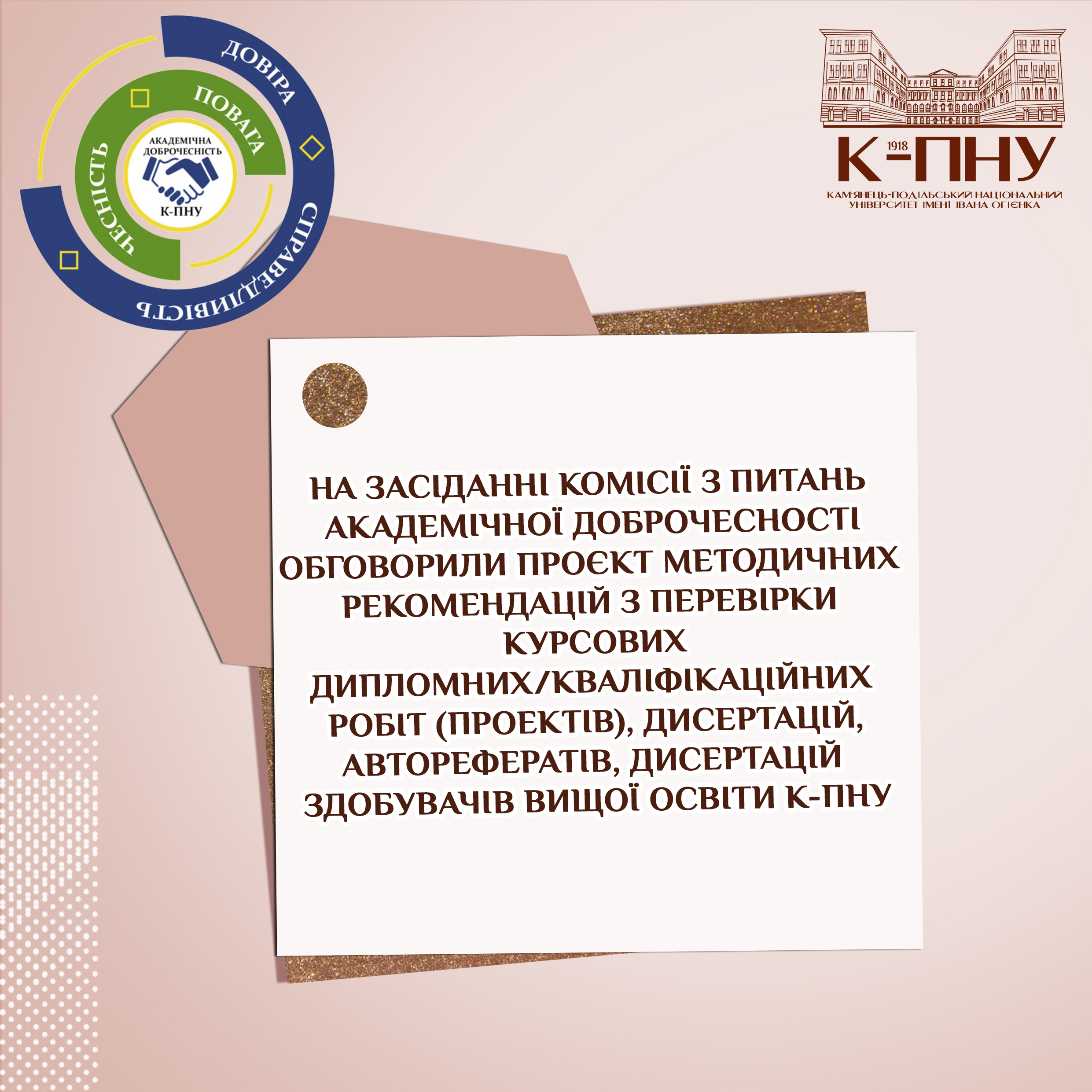 26 жовтня відбулося чергове засідання комісії з питань академічної доброчесності Кам’янець-Подільського національного університету імені Івана Огієнка. Ключовим питанням порядку денного було обговорення проєкту Методичних рекомендацій з перевірки курсових дипломних/кваліфікаційних робіт (проектів), дисертацій, авторефератів, дисертацій здобувачів вищої освіти Кам’янець-Подільського національного університету імені Івана Огієнка на академічний плагіат.