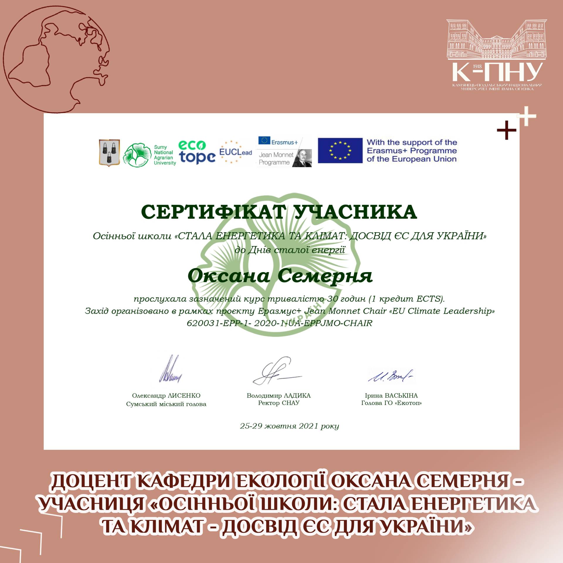 Із 25 до 29 жовтня в межах Міжнародного грантового проєкту Еразмус+ Жан Монне «Кліматичне лідерство Європейського союзу» відбулася «Осіння школа: стала енергетика та клімат — досвід ЄС для України», участь у якій взяла Оксана Семерня, доктор педагогічних наук, доцент кафедри екології.