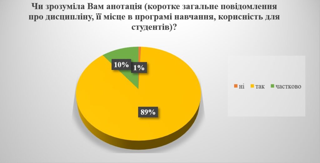 89% (251 особа) опитаних відповіли, що анотація до навчальної дисципліни є зрозумілою, і лише 10% (30 осіб) дали відповідь «частково».