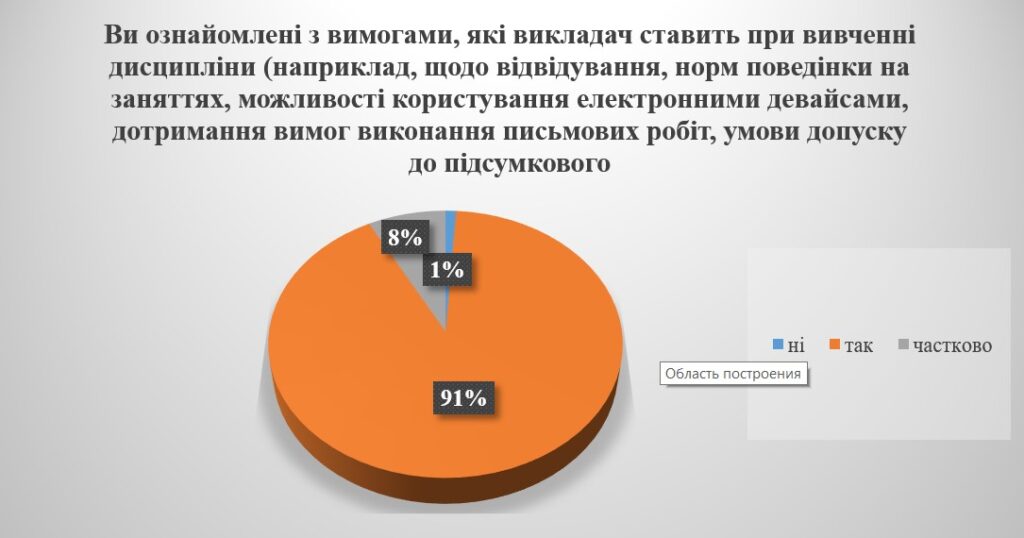 Важливо зауважити, що 91% респондентів (258 осіб) ознайомлені з вимогами, які викладач ставить під час вивчення дисципліни (наприклад, щодо відвідування, норм поведінки на заняттях, можливості користування електронними девайсами, дотримання вимог виконання письмових робіт, умови допуску до підсумкового контролю тощо, 8% (22 особи) – частково ознайомлені, та 1% (3 особи) – не ознайомлені.