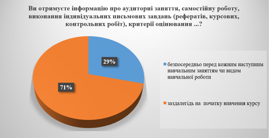 Більшість респондентів, а саме 71% (202 особи), отримують інформацію про аудиторні заняття, самостійну роботу, виконання індивідуальних письмових завдань (рефератів, курсових, контрольних робіт), критерії оцінювання заздалегідь на початку вивчення курсу, натомість 29% (81 особа) – безпосередньо перед кожним наступним навчальним заняттям чи видом навчальної роботи.