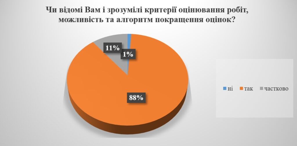 Важливим є той факт, що 88% (250 осіб) опитаних є зрозумілими критерії оцінювання робіт, можливість та алгоритм покращення оцінок, 11% (30 осіб) – частково зрозуміло, та 1% (3 особи) – не зрозуміло.