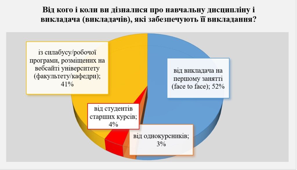 52% (148 осіб) опитаних на запитання: «Від кого і коли Ви дізналися про навчальну дисципліну і викладача (викладачів), які забезпечують її викладання?» відповіли, що дізналися від викладача на першому занятті (face to face), а 41% (117 осіб) із силабусу/робочої програми, розміщених на вебсайті університету (факультету/кафедри).