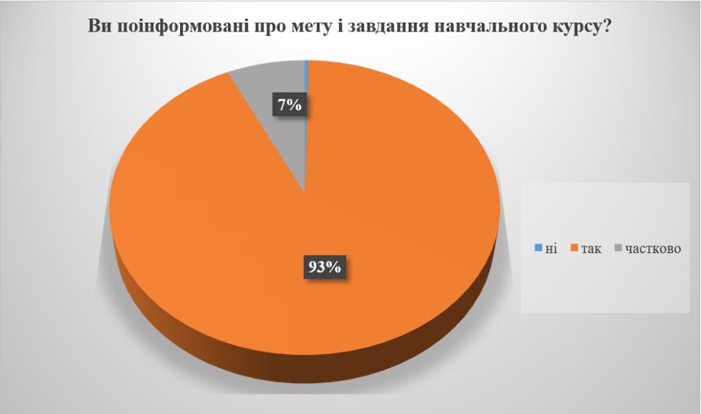 Позитивним є той факт, що 93% (262 особи) опитаних здобувачів вищої освіти поінформовані про мету та завдання навчального курсу, і лише 7% (20 осіб) частково поінформовані.