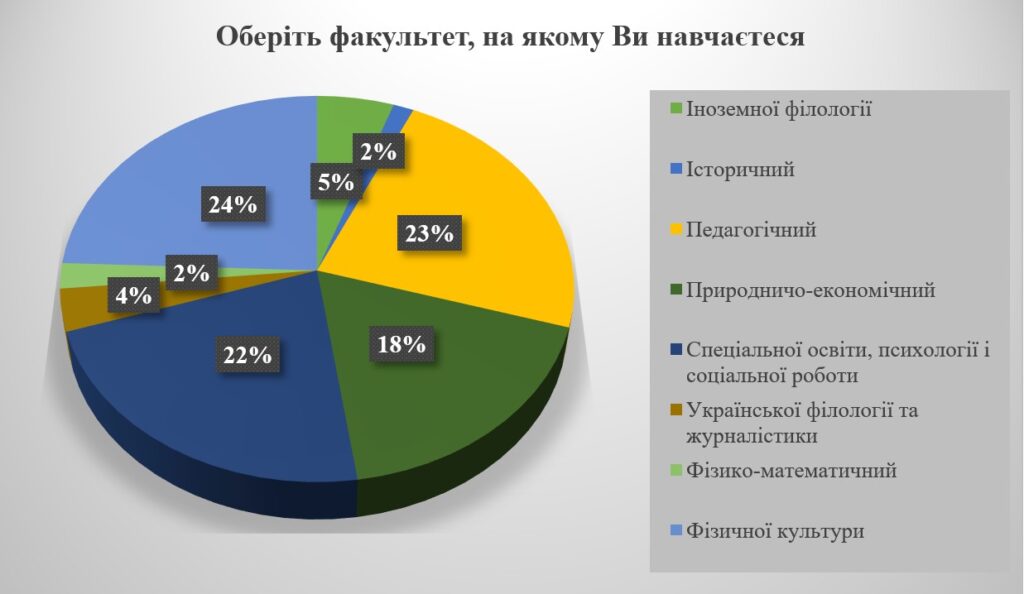 Участь в анкетуванні взяли 283 здобувачі вищої освіти. Серед опитаних найбільше було здобувачів вищої освіти факультету фізичної культури 24% (69 осіб), педагогічного факультету 23% (65 осіб) та факультету спеціальної освіти, психології і соціальної роботи 22% (63 особи).