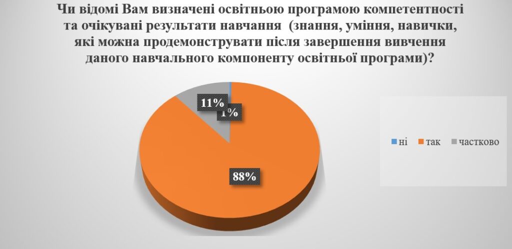 У 88% відповідей здобувачів вищої освіти (250 осіб) зазначено, що їм відомі компетентності та очікувані результати навчання, визначені їхньою освітньою програмою.