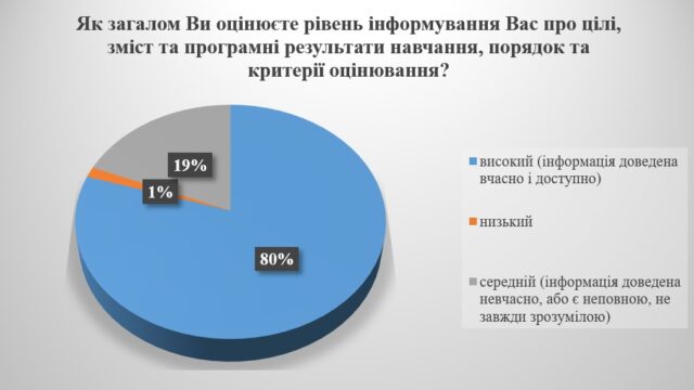 Під час опитування на запитання «Як загалом Ви оцінюєте рівень інформування Вас про цілі, зміст та програмні результати навчання, порядок та критерії оцінювання?» здобувачі вищої освіти у 80% (226 осіб) зазначили, що інформація доведена вчасно і доступно, у 19% (53 особи) інформація доведена невчасно або є неповною, не завжди зрозумілою.