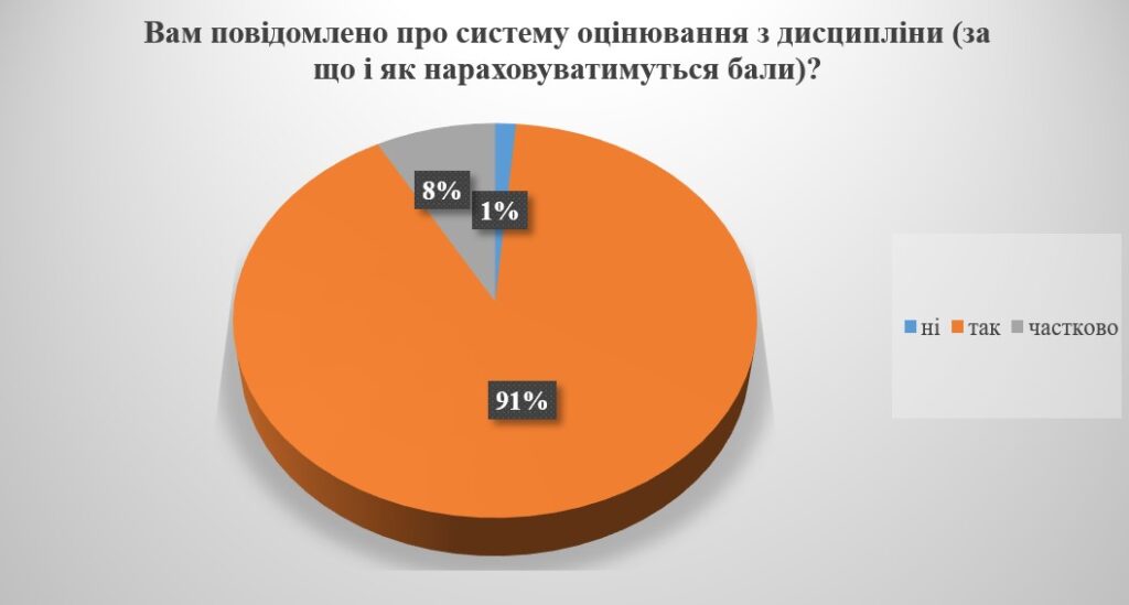 91% опитаних (265 осіб) було повідомлено про систему оцінювання з навчальної дисципліни, 8% (23 особи) частково повідомлено, та 1% (4 особи) не повідомлено.