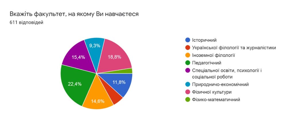 Участь в анкетуванні взяли 611 здобувачів вищої освіти. Серед опитаних найбільше було здобувачів вищої освіти педагогічного факультету 22,4% (137 осіб), факультету фізичної культури 18,8% (115 осіб) та факультету спеціальної освіти, психології і соціальної роботи 15,4% (94 особи).