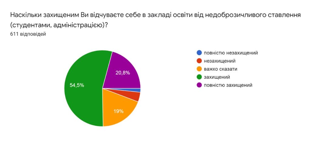 54,5% (333 особи) відчувають себе захищеним у закладі освіти від недоброзичливого ставлення (студентами, адміністрацією), 20,8% (127 осіб) – повністю захищеними 19% (116 осіб) відповіли «важко сказати», 1,6% (10 осіб) відчувають себе повністю незахищеними.