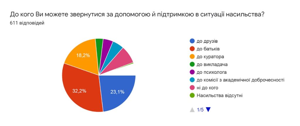 За допомогою й підтримкою в ситуації насильства здобувачі вищої освіти найчастіше звертаються: до батьків 32,2% (197 осіб), до друзів 23,1% (141 особа), до кураторів 18,2% (111 осіб), до викладача 3,4% (21 особа), 7,9% (48 осіб) ні до кого.