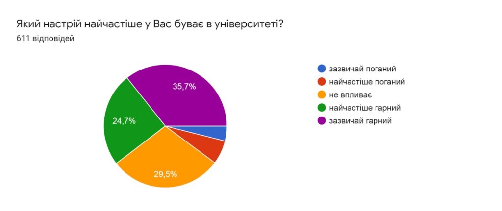 35,7% (218 осіб) респондентів на запитання: «Який настрій найчастіше у Вас буває в університеті?» відповіли, що зазвичай гарний, а 24,7% (151 особа) зазначили, що найчастіше гарний.