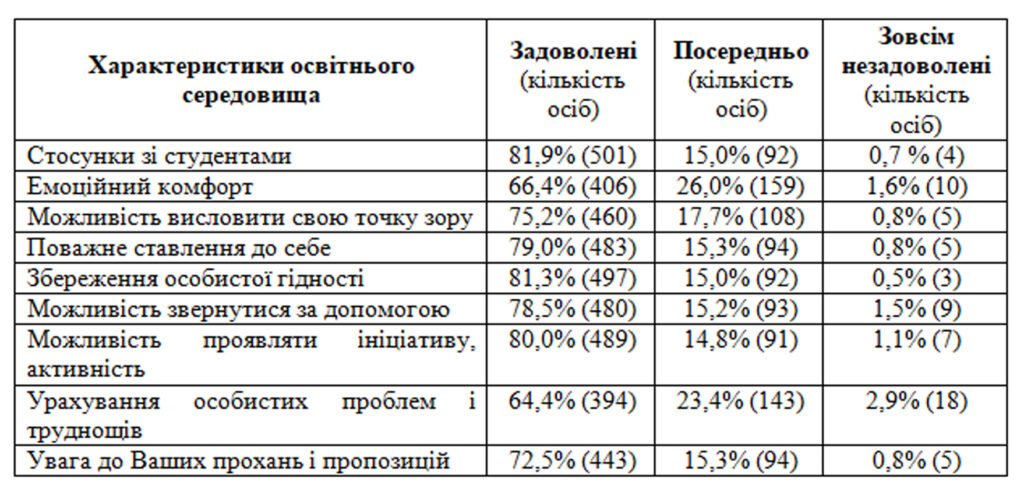 Аналіз характеристик освітнього середовища засвідчив, що 81,9% (501 осіб) здобувачів вищої освіти задоволені міжособистісними стосунками; 66,4% (406 осіб) відчувають емоційний комфорт; 79% (483 особи) поважне ставлення до себе; 81,3% (497 осіб) збереження особистої гідності; 80% (489 осіб) мають можливість проявляти ініціативу, активність; 75,2% (460 осіб) можуть висловити свою точку зору; 78,5% (480 осіб) мають можливість звернутися за допомогою; 64,4% (394 особи) респондентів задоволені, що під час освітнього процесу враховують їхні особисті проблеми та труднощі; 72,5% (443 особи) відчувають увагу до власних прохань і пропозицій.