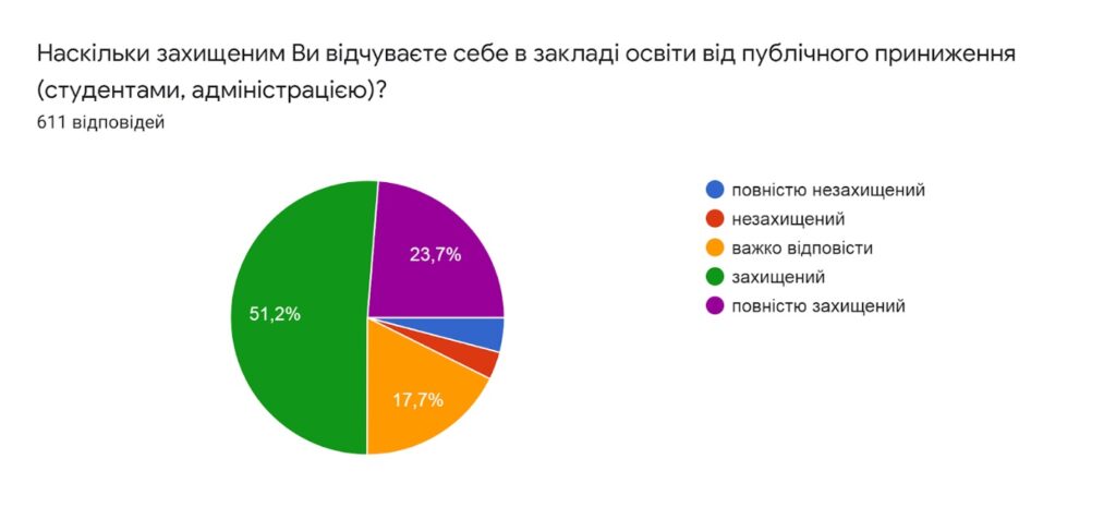 Позитивним є той факт, що із 74,9% опитаних (458 осіб) 51,2% (313 осіб) відчувають себе захищеним, а 23,7% (145 осіб) – повністю захищеним, натомість 4,1% (25 осіб) відчувають себе повністю незахищеними від публічного приниження (студентами, адміністрацією).