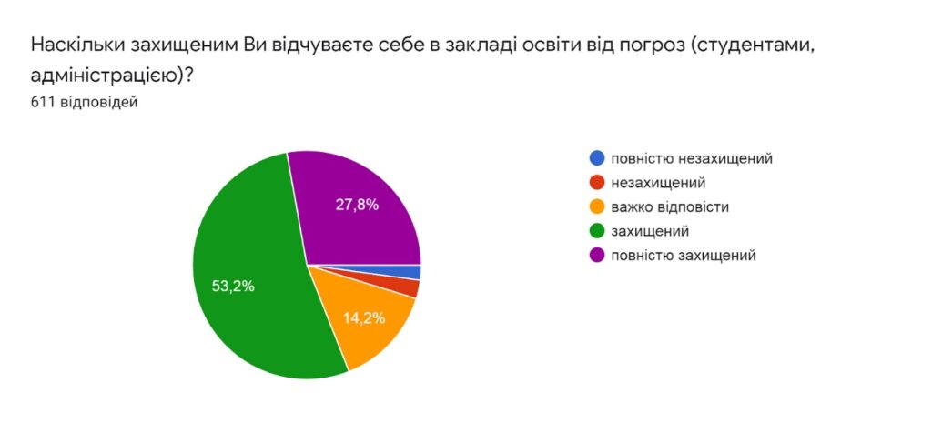 Від погроз (студентами, адміністрацією) в університеті захищеними відчувають себе 53,2% (325 осіб), повністю захищеними – 27,8% (170 осіб), повністю незахищеними – 2,1% (13 осіб).
