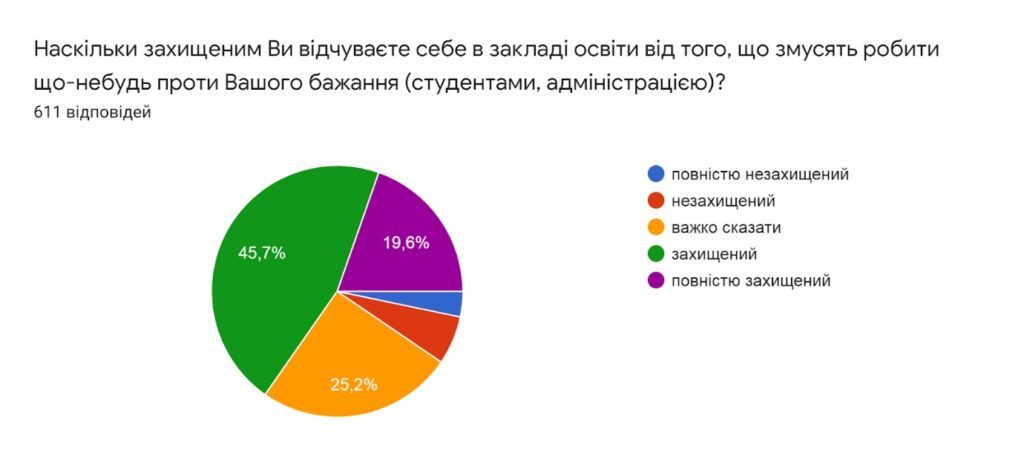 На запитання «Наскільки захищеним Ви відчуваєте себе в закладі освіти від того, що змусять робити що-небудь проти Вашого бажання (студентами, адміністрацією)?» 45,7% (279 осіб) здобувачів вищої освіти зазначили, що відчувають себе захищеними, 19,6% (120 осіб) – повністю захищеними, 25,2% (154 особи) відповіли «важко сказати», а 3,3% (20 осіб) відчувають себе повністю незахищеними.