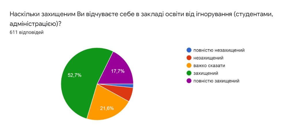 Від ігнорування (студентами, адміністрацією) в університеті захищеними відчувають себе 52,7% (322 особи), 17,7% (108 осіб) повністю захищеними, 21,6% (132 особи) опитаних важко відповісти на запитання, 1,6% (10 осіб) відчувають себе повністю незахищеними.