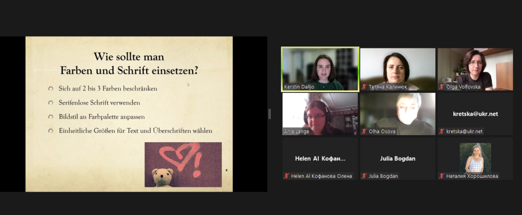 26-27 листопада науково-педагогічні працівники кафедри німецької мови – завідувач кафедри, доцент Тетяна Калинюк, доцент Тетяна Боднарчук і старший викладач Олена Шмирко взяли участь у науково-практичній конференції «Наукові дослідження і наукове писемне мовлення в Україні та Німеччині», організованої в межах програми «Sur-Place та спеціалізовані мовні курси у Центрально-Східній, Південно-Східній та Східній Європі, а також на Кавказі та у Центральній Азії 2021» за підтримки Німецької служби академічних обмінів (ДААД) та Федерального міністерства закордонних справ Республіка Німеччини.