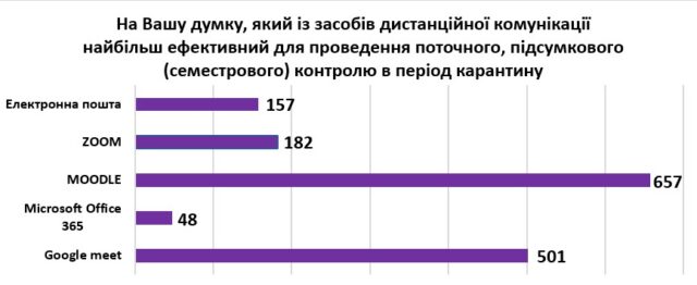 На запитання «Наскільки, на Вашу думку, є ефективним проведення поточного, підсумкового (семестрового) контролю в період карантину за допомогою системи MOODLE та інших дистанційних технологій навчання?» 74% опитаних вважають ефективним, 18% вважають дуже ефективним, і лише 8% вважають неефективним.