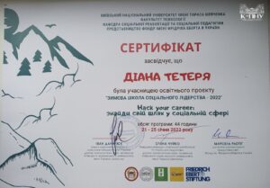 Двадцять соціально активних студентів і лідерів молодіжних ініціатив зібралися в Карпатах аби шукати і знаходити: сенси, зміст, шлях, інструменти … і себе в соціальній сфері. По завершенні навчання Діана отримала сертифікат учасника освітнього проєкту «Зимової школи соціального лідерства-2022» Hack your career: знайди свій шлях у соціальній сфері (обсяг програми – 44 год).