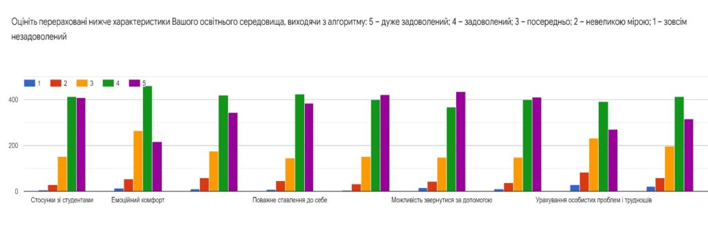 Аналіз характеристик освітнього середовища засвідчив, що значна кількість здобувачів вищої освіти задоволені міжособистісними стосунками, відчувають емоційний комфорт і поважне ставлення до себе, що свідчить про якісне безпечне освітнє середовища в К-ПНУ.