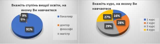 В анкетуванні взяли участь 358 бакалаврів (91%) (2021 р. – 744 (92%) та 36 магістрів (9%) (2021 р. – 69 (8%), серед яких 16% здобувачів вищої освіти 1 курсу, 28% – 2 курсу, 29% – 3 курсу і 28% – 4 курсу.