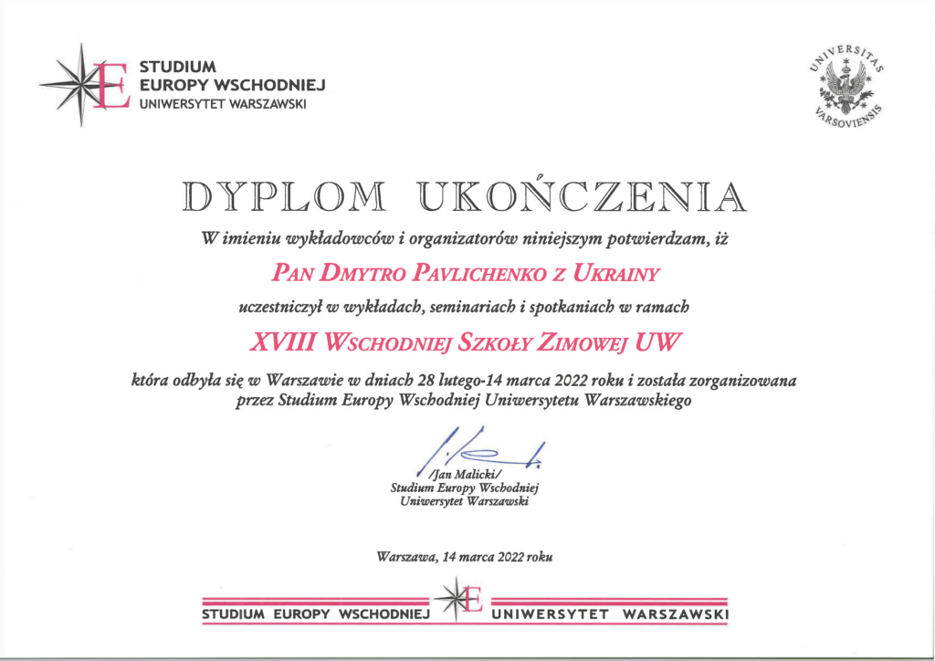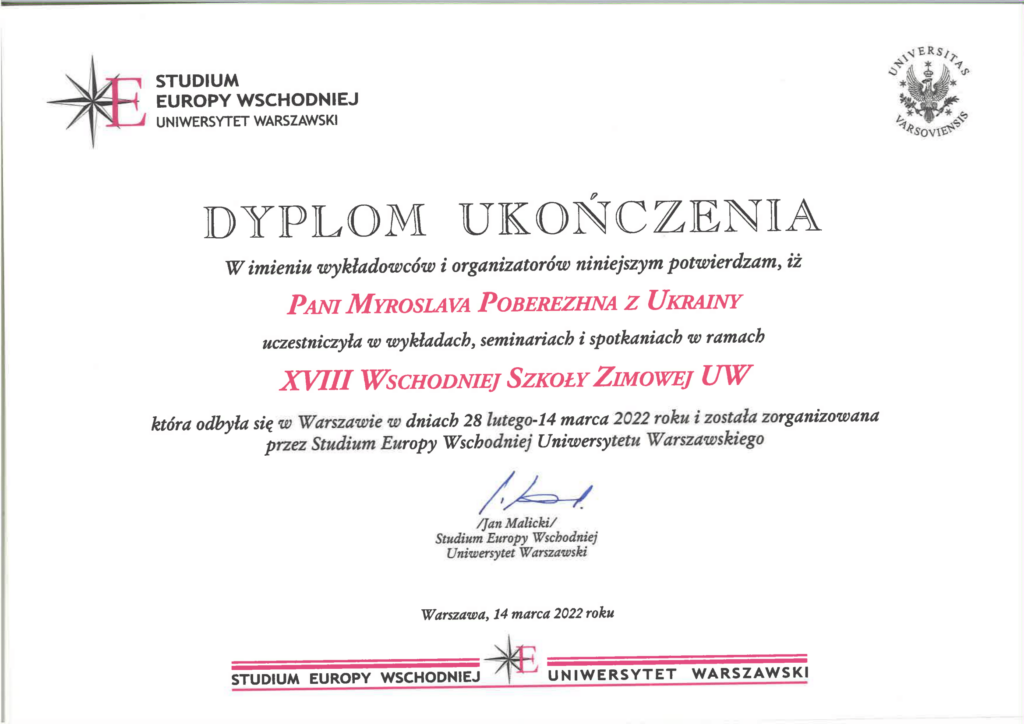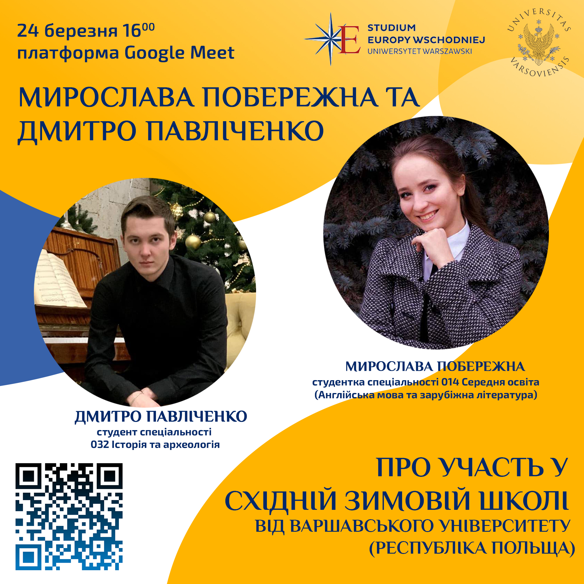 Запрошуємо на онлайн-зустріч із Мирославою Побережною, студенткою спеціальності 014 Середня освіта (Англійська мова та зарубіжна література) та Дмитром Павліченком, студентом спеціальності 032 Історія та археологія, учасниками Східної зимової школи, організованої Центром Східноєвропейських студій Варшавського університету. Мирослава та Дмитро радо поділяться набутими знаннями, досвідом, новими враженнями та дадуть відповідь на усі запитання щодо участі у програмі міжнародної академічної мобільності.