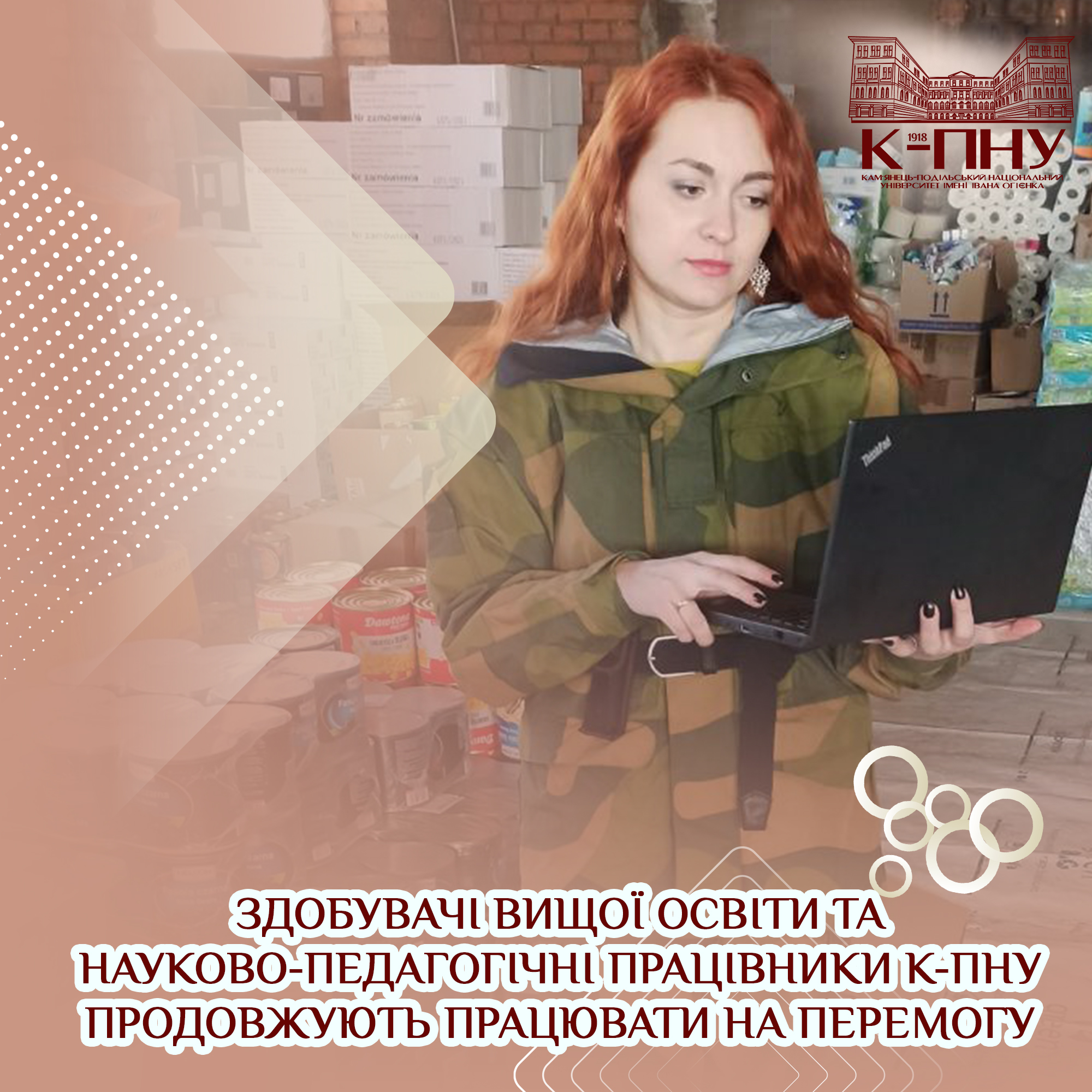 Здобувачі вищої освіти та наукоао-педагогічні працівники К-ПНУ продовжують захищати Україну в лавах ЗСУ та Територіальної оборони. І вдень і вночі вони оберігають наш спокій на блокпостах і дають рішучу відсіч окупанту на передовій. Ми намагаємось забезпечити їм гідний тил, продовжуємо працювати на перемогу: координуємо збір коштів, займаємося зварювально-монтажними роботами на місцях, формуємо гуманітарні вантажі, допомагаємо внутрішньо переміщеним особам, надаємо їм прихисток у гуртожитках університету ( на сьогодні в гуртожитках К-ПНУ проживає понад 300 осіб), сприяємо їх облаштуванню тощо.
