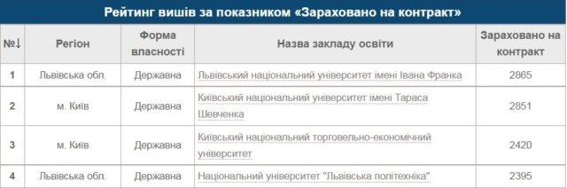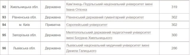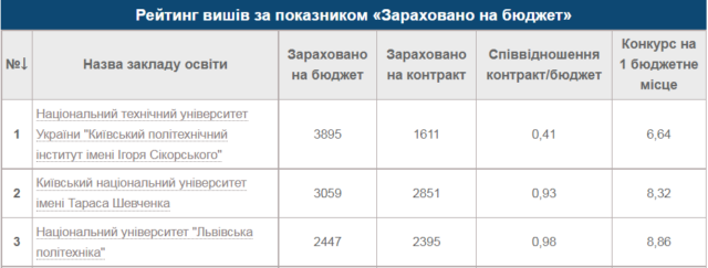 Рейтинг: Вступники, зараховані на бюджет. Рейтингова таблиця визначає заклади, до яких було зараховано найбільшу кількість вступників на навчання за кошти державного бюджету на перший курс для здобуття ступеня бакалавра (магістра медичного, фармацевтичного або ветеринарного спрямувань.