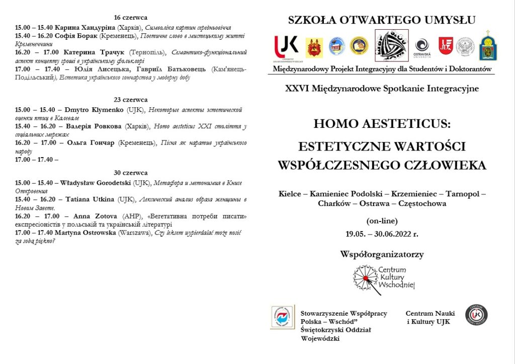 2 червня 2022 року відбулася третя зустріч-обговорення студентських наукових робіт ХХVІ Міжнародної конференції «HOMO AESTETICUS: ESTETYCZNE WARTOŚCI WSPÓŁCZESNEGO CZŁOWIEKA» (Kielce – Kamieniec Podolski – Krzemieniec – Tarnopol – Charków – Ostrawa – Częstochowa), що зреалізовує Міжнародний інтеграційний проєкт для студентів, магістрантів і аспірантів «SZKOŁA OTWARTEGO UMYSŁU» за сприяння Університету ім. Я. Кохановського в м. Кельце (Республіка Польща). Студентка ІІІ курсу спеціальності 014 Середня освіта (Українська мова і література) навчально-наукового інституту української філології та журналістики Вікторія ДОРОГА виголосила доповідь «Порівняння в національній призмі українського художнього мовлення (на матеріалі творів Ірини Вільде)» (керівник – доктор філологічних наук, доцент кафедри української мови Наталія КОВАЛЕНКО).