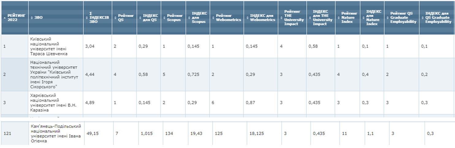 Цьогоріч К-ПНУ посів у рейтингу 121 місце. Упродовж останніх років Університет Огієнка підтверджує свої стабільно високі позиції, входячи до переліку двохсот кращих закладів вищої освіти України, зокрема у 2022 р. покращив свої індекси показників QS World University Rankings (оцінюється академічна діяльність) і Scopus (оцінюється науково-видавнича діяльність).