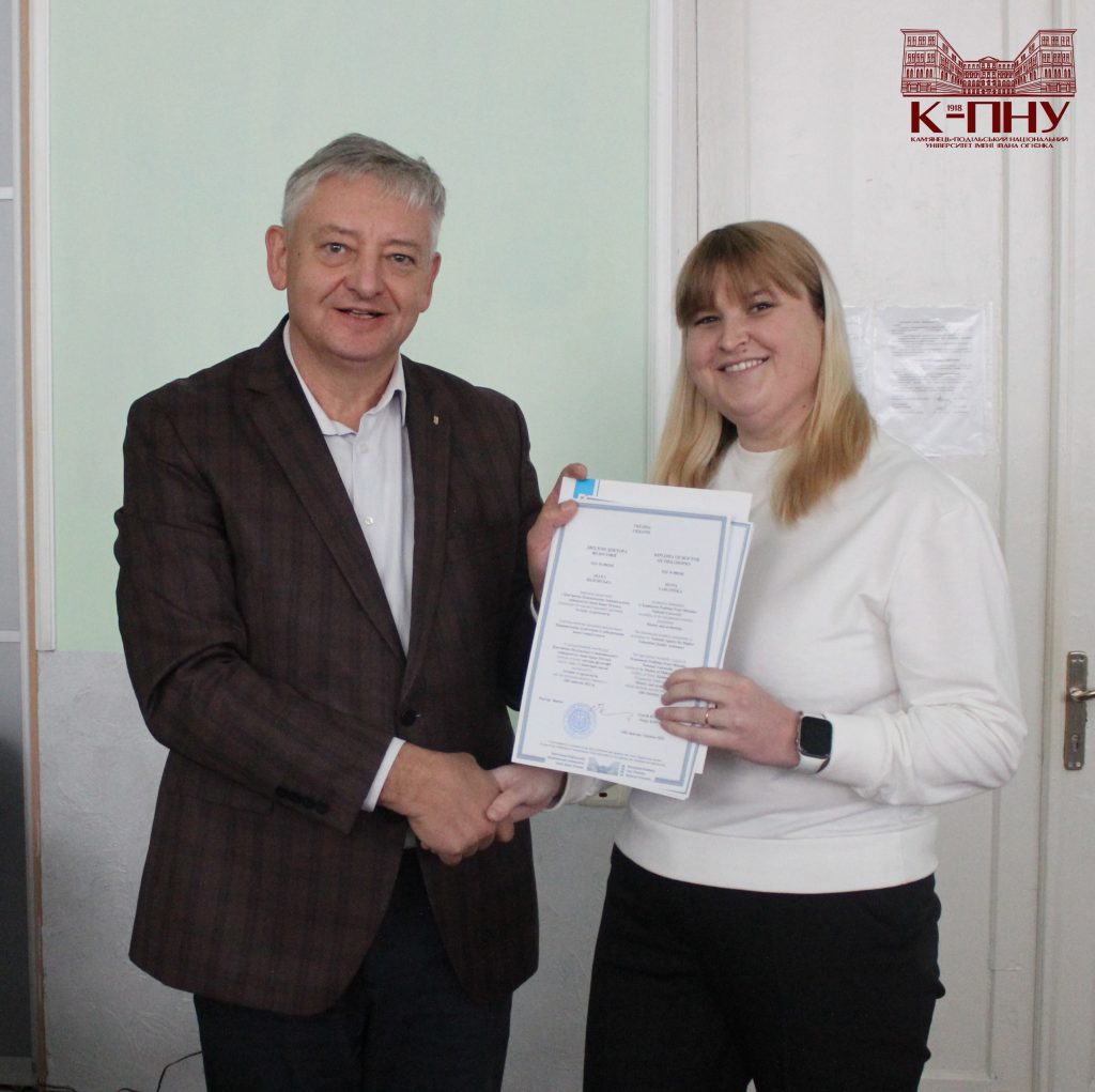 Діана Русланівна цьогоріч закінчила навчання в аспірантурі за спеціальністю 32 Історія та археологія та успішно захистила дисертацію на тему «Кам’янець-Подільський інститут народної освіти в системі педагогічних вишів УСРР (1921-1930 рр.): історичний аспект» (науковий керівник – доктор історичних наук, професор, завідувач кафедри історії України Олександр Завальнюк).