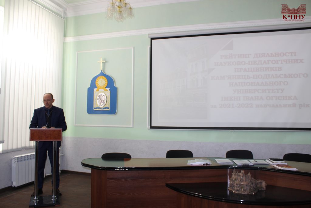 Учасники засідання розглянули питання щодо результатів рейтингу науково-педагогічних працівників Кам’янець-Подільського національного університету імені Івана Огієнка у 2021-2022 навчальному році (доповідав в. о. проректора з науково-педагогічної роботи, керівник навчально-методичного центру забезпечення якості освіти Геннадій Бесарабчук).
