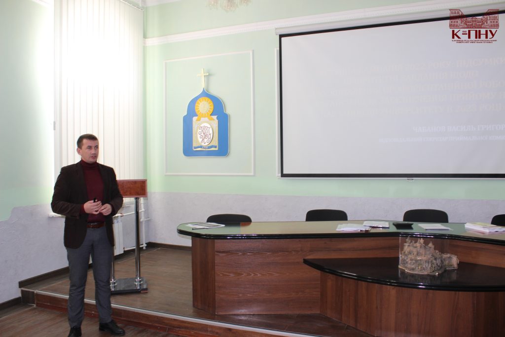 Відповідно до порядку денного засідання розглянули питання щодо підсумків вступної кампанії 2022 року (доповідав відповідальний секретар приймальної комісії Василь Чабанов). Василь Григорович визначив пріоритетні завдання щодо вдосконалення профорієнтаційної роботи, організації та забезпечення прийому на навчання до університету в 2023 році.