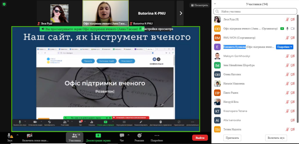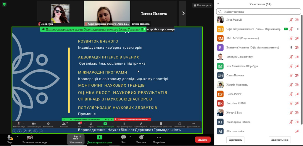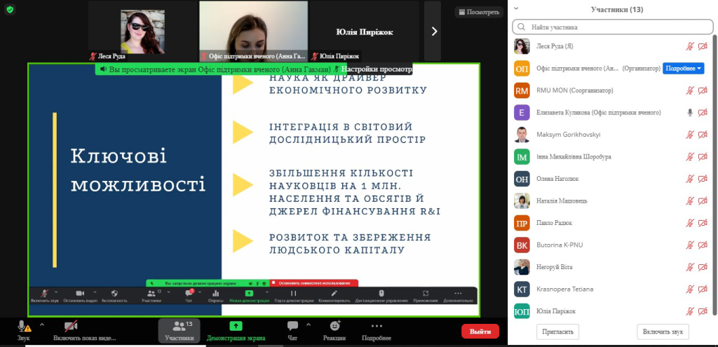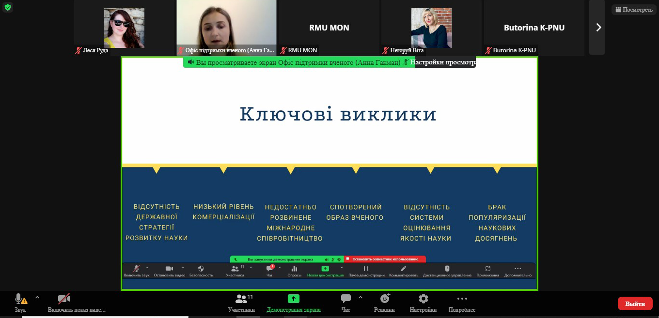 Координатори зустрічі Елизавета Куликова та Анна Гакман ознайомили науковців з особливостями роботи Офісу та обговорили проєкт «Регіональних офісів підтримки вчених».