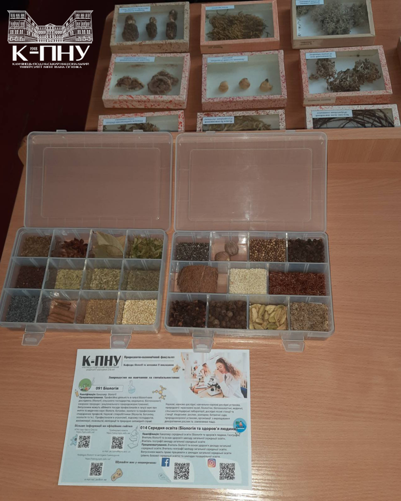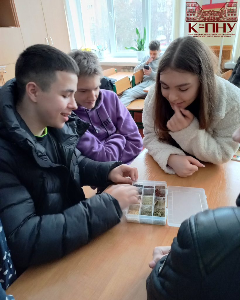 Кандидат біологічних наук, доцент Ольга Оптасюк ознайомила учнів із сучасними напрямами мікроморфологічних досліджень, розповіла про пилок і спори різних видів. Одинадцятикласники блискуче впорались із визначенням насіння, спецій у запропонованих колекціях.