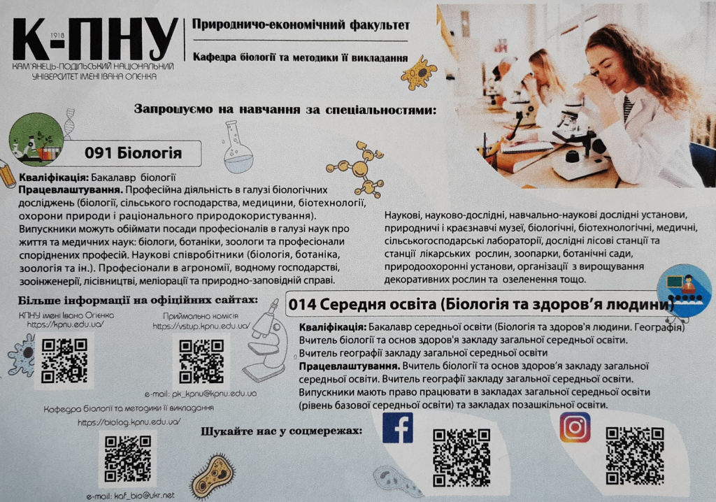 06 грудня представники К-ПНУ продовжили профорієнтаційну роботу й популяризацію біологічних спеціальностей. «Сучасні напрямки та перспективи розвитку біології» – саме під такою назвою відбулася зустріч викладачів кафедри біології та методики її викладання з 11-класниками Кам’янець-Подільського ліцею № 14. Поспілкувались щодо специфіки й переваг навчання на спеціальностях 014 Середня освіта (Біологія та здоров’я людини) і 091 Біологія, можливостями подальшого працевлаштування.